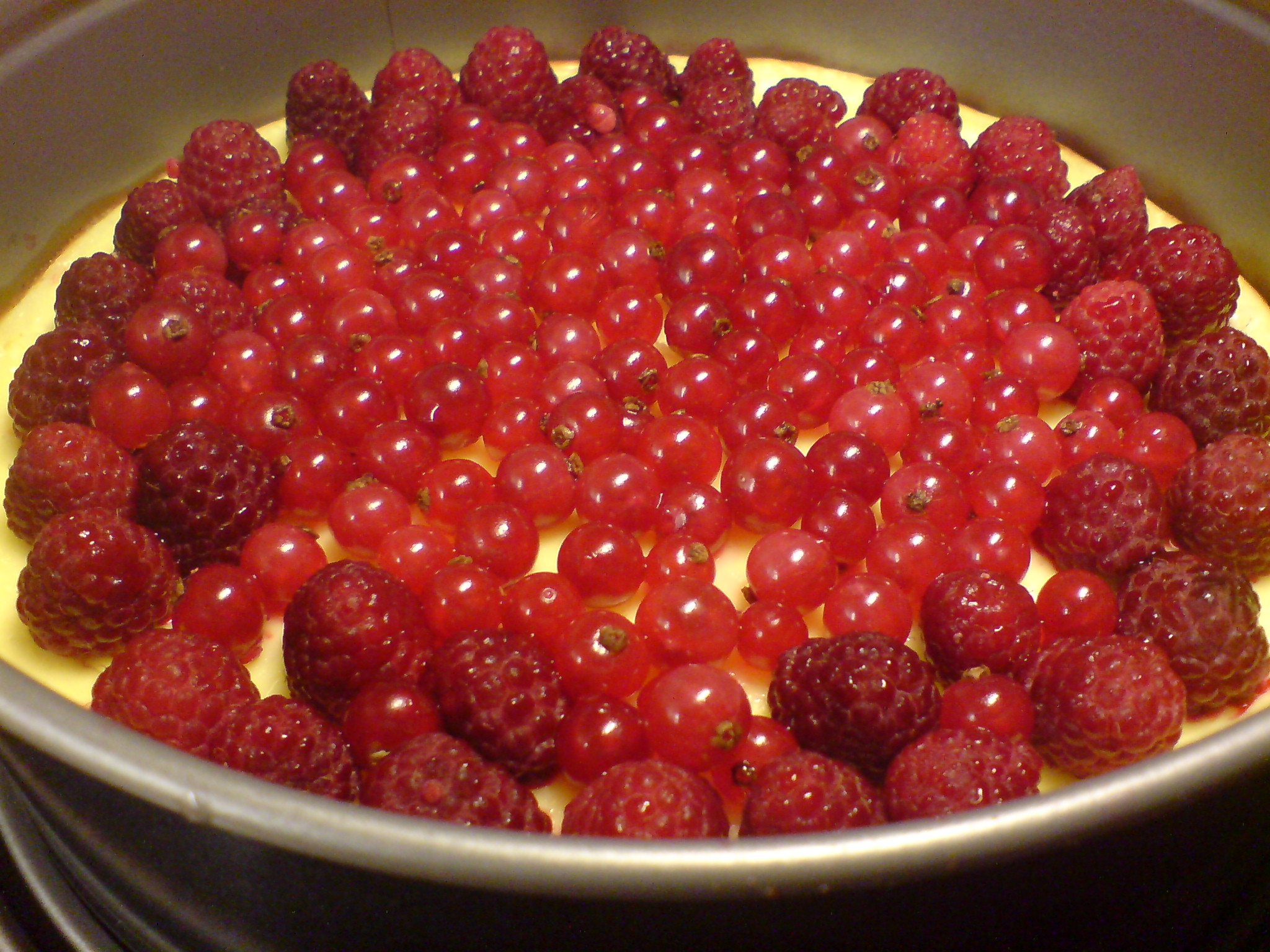 Halloncheesecake med röda vinbär » Halloncheesecake med röda vinbär innan hallongelén hällts på.