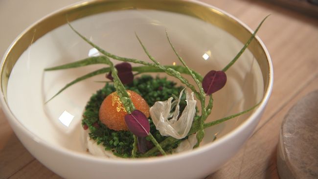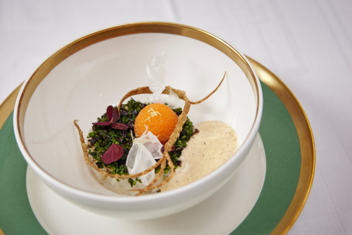 Piggvar och kammussla med växter från havet, brynt smör och löjrom.