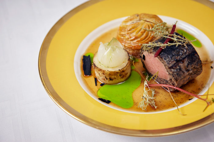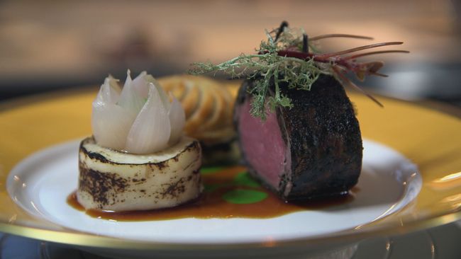 Glödbakad kalv svept i svamp, rotselleri och äpple samt rostad sellerijuice, serveras med potatispithiviers.