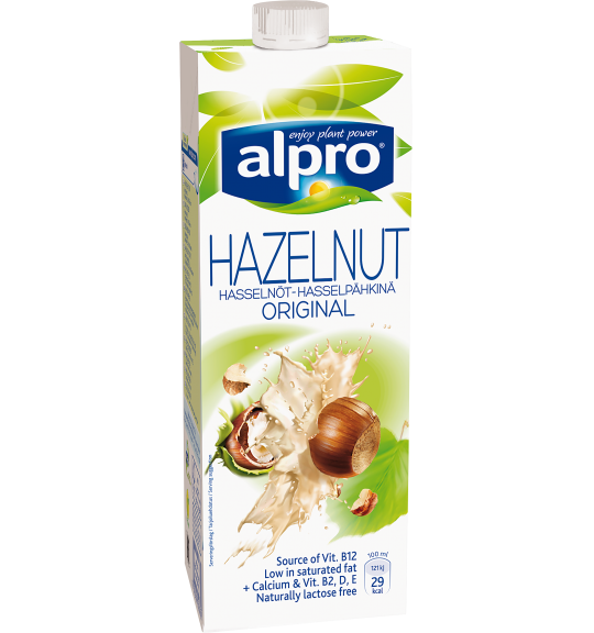 Alpro Hasselnöt Original är tillverkad av hela, rostade hasselnötter och drycken är fri från laktos. Jag tycker den är lite mättande och lyxar till helgen. Lika mycket kalcium som i mellanmjölk men betydligt lägre proteinhalt, med bara en tiondel. och mindre socker fast den smakar sötare än mjölk. Innehåller lite E-vitamin från hasselnötterna.