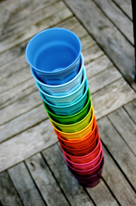 Jag hade tänkte mig rosa, men kanske någon orange, gul, röd..ja jo lite färger som är fina i kombination. Det blev 6 stycken i regnbågens färger och på väg mot kassan såg jag att det var erbjudande på dem. Vilken tur! Det blev färgerna red, orange, yellow, fuchsia, apple green och aqua. Väl hemma staplade jag dem och det var svårt att ställa in dem i ett köksskåp, för de var en sådan vacker färgklick i köket.