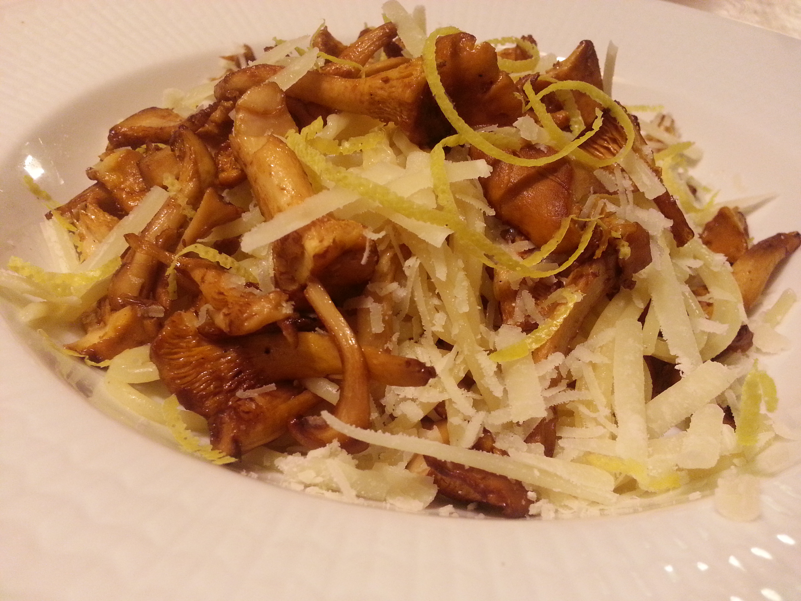 Rensa kantarellerna och riv dem i grova bitar. Hetta upp en stor stekpanna med en smör. Smörstek kantarellerna tills all vätska kokat bort. Krydda med salt.