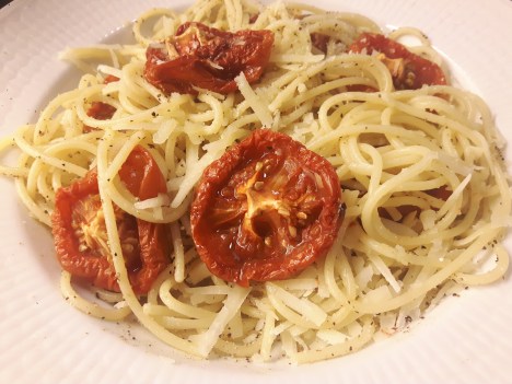 Passa på att skjutsa in en batch tomathalvor när ugnen ändå används och fortsätt sedan ugnsbaka tomaterna när den andra rätten är klar. Gör så mycket som möjligt och låt halvorna trängas i formen då de minskar med tiden. Välj inte de största tomaterna, för ju större tomater ju längre tid. De färdiga tomathalvorna kan sedan användas under i veckan som tillbehör till middagen, i en god paj som Västerbottenspaj, tillsammans med kantareller i en ostpaj, någon halva eller två kan mixas ner i en god röra som bönröran med vita bönor eller i en hummus, eller värmas upp och skäras i bitar att blanda runt i nykokt spaghetti med olivolja & nyriven parmesan som en enkel & snabb pastarätt.