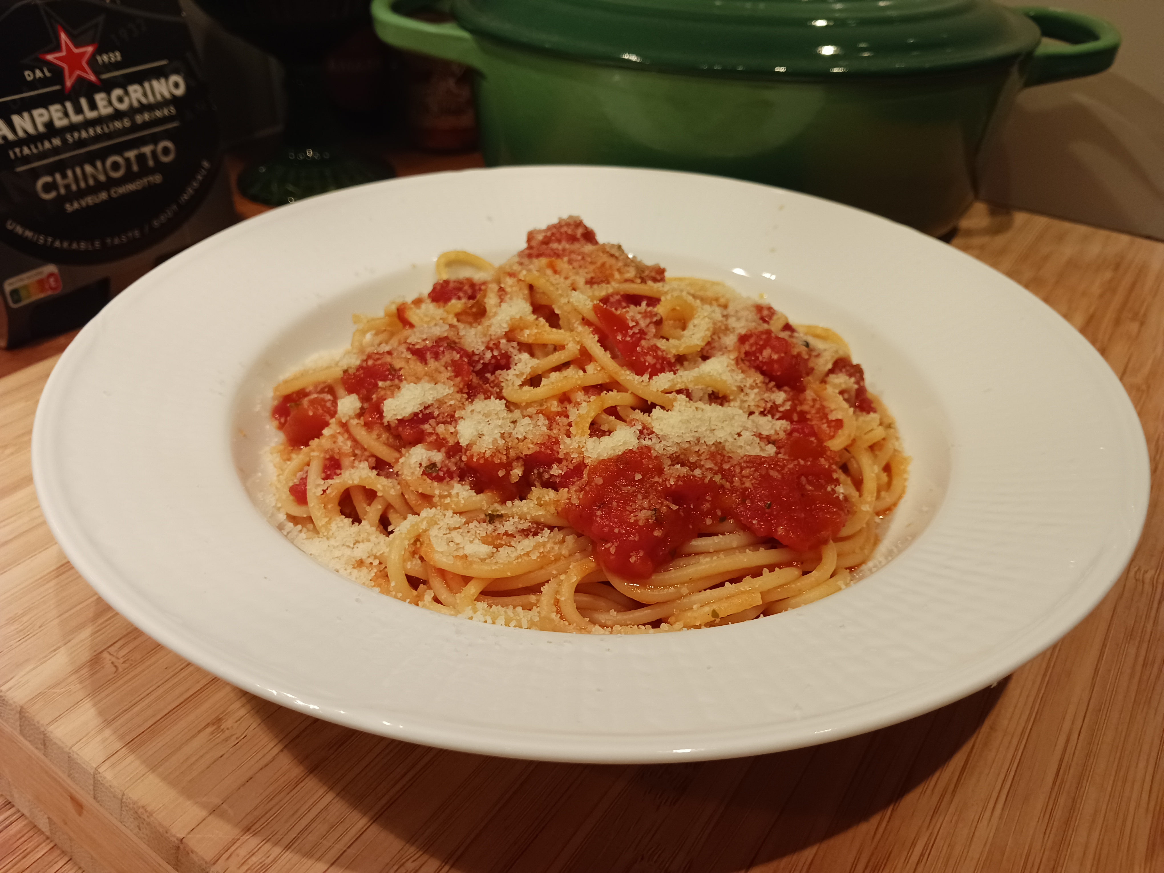 Mycket god pasta med koncentrerad djup fyllig tomatsmak – en härlig rätt vilken dag som helst året om. Parmesan kan rivas över men det är något med den starka tomatsmaken som lockar att äta den allena. Så god.