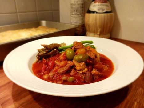 Lammbog var styckningsdelen som skulle användas och efter att varit i 6 mataffärer eller fler konstaterar jag att det är nog inte bara så att jag glömmer att laga lamm utan avsaknaden av lamm i mataffärer bidrar starkt. Jag hittade inte lammbog varken bland färskt lätt eller i frysen. Det som fanns vara lammstek, så det fick det bli. Jag valde att låta grytan småputtra på spisen i 3 timmar i stället för i ugnen och så tillsatte jag en nypa socker. Till grytan serverade jag kokt potatis, kokta gröna bönor och stekt färsk kronärtsskocka samt en bit bubblig focaccia.