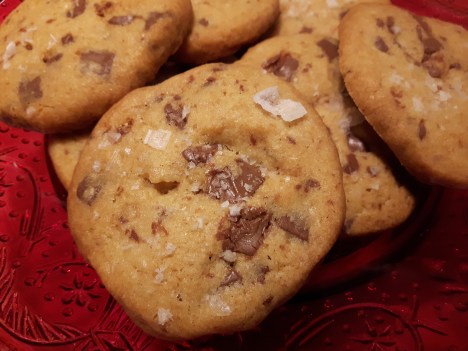 Kakor med chokladbitar och havssalt – småkakor med tre sorters socker, vitt socker, farinsocker och vaniljsocker, med bitar av mellanmörk choklad sprinklade med havssalt.