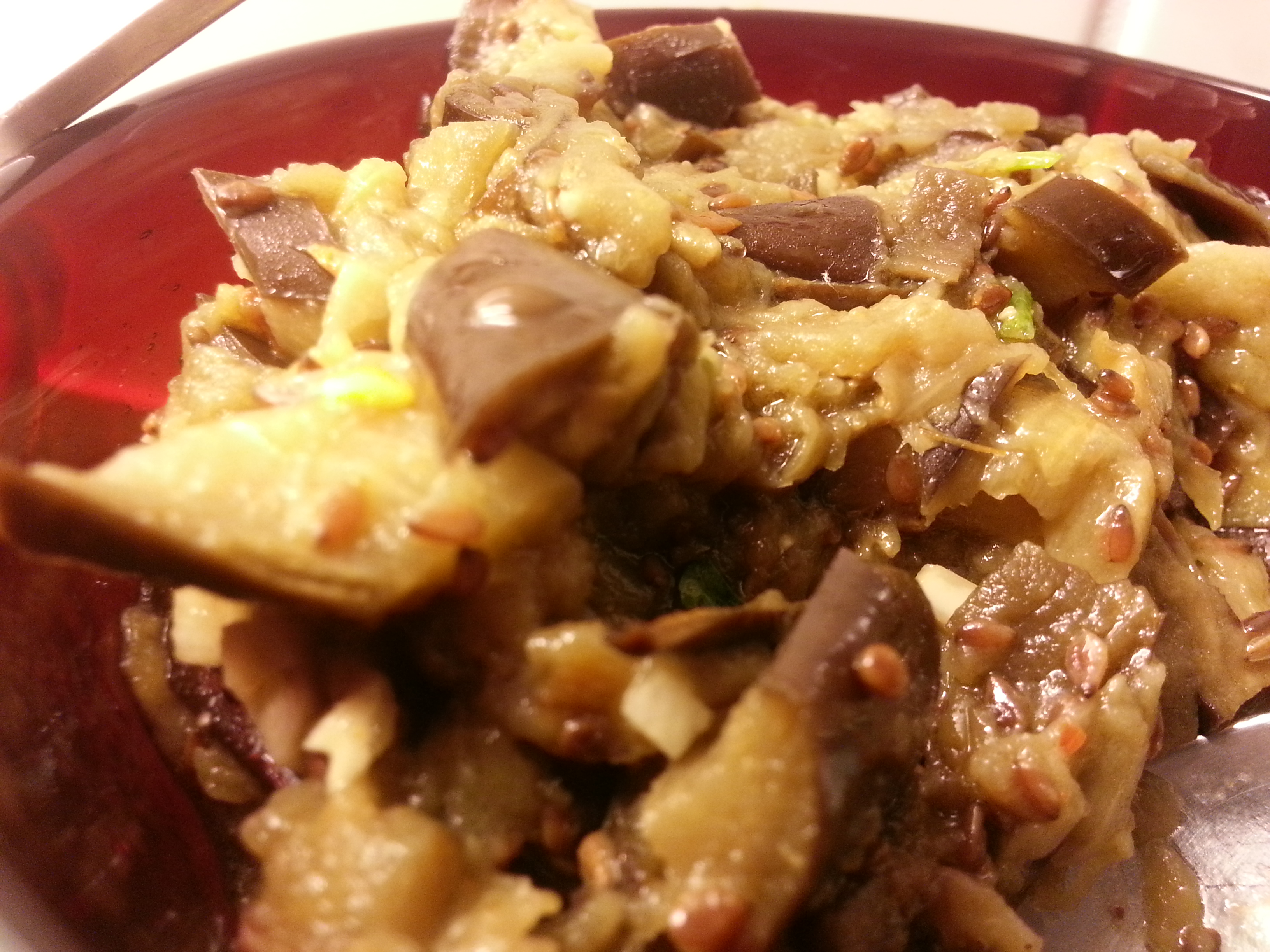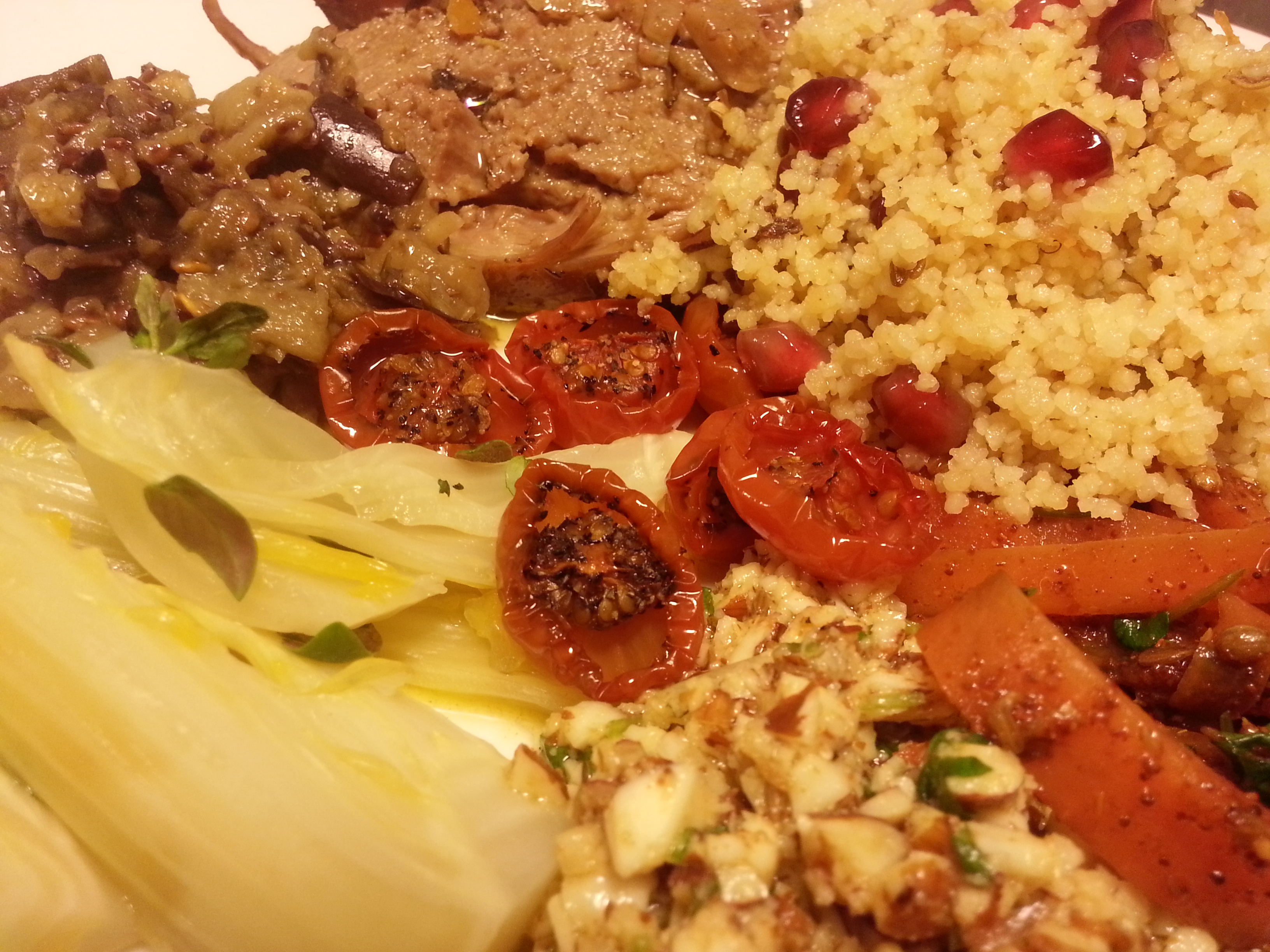 Jag rostade en matsked sesamfrön och blandade i aubergineröran och smakade av den med lite sesamolja, vilket blev en mycket god variant. Glömde köpa mynta, men couscousen blev supergod ändå och sedan hoppade jag vitlöken till tomaterna och lät dem baka i ugn någon timme längre.