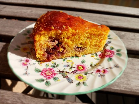 Clementinkaka med björnbär – mjuk mandelkaka med mixade hela clementiner och färska björnbär smaksatt med lite bittermandel.