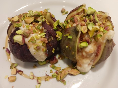 Fikon fyllda med ricotta – Färska mörklila fikon fyllda med ricotta sötad med akaciahonung och smaksatt med clementinzest toppade med salta hackade pistagenötter överringlad med akaciahonung.